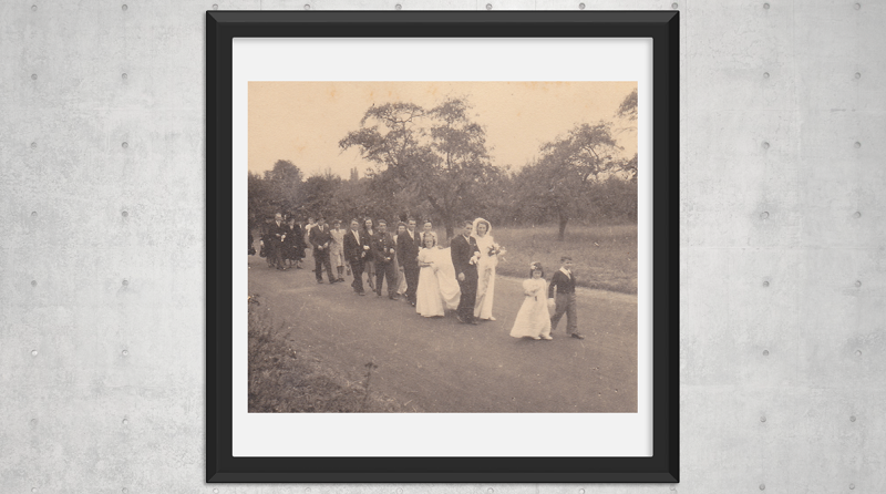 Nous sommes en septembre 1947, au Mesnil-le-Roi dans les Yvelines. Nos grands-parents maternels Jean et Madeleine vont se dire oui pour la vie. J’adore cette photo car elle n’a rien d’un cliché classique de mariage. Le couple et son cortège se dirigent joyeusement vers l’église, et même si l’instant sera solennel, tout ce petit monde est détendu et souriant. J’entends presque les conversations qui vont bon train, les amis de nos grands-parents juste derrière les mariés s’interrogent sur le repas à suivre, et tout à gauche de la photo ma grand-tante Yvonne tente de calmer son bébé qui n’apprécie que modérément l’exercice, sous les yeux de nos arrière-grands-parents. Alors non je n’ai pas une vue de lynx, j’ai juste quelques autres photos de ce cortège sur lesquelles on peut reconnaître certains collatéraux. Je ne sais pas combien de temps a duré la promenade à travers champs, mais j’aime beaucoup cette idée d’un cortège allant de la mairie ou du domicile, jusqu’à l’église à pied. Quatorze mois plus tard, notre mère viendra animer la vie du couple. Suivront trois garçons, nos oncles. La génération SimPieFraDan est en marche.