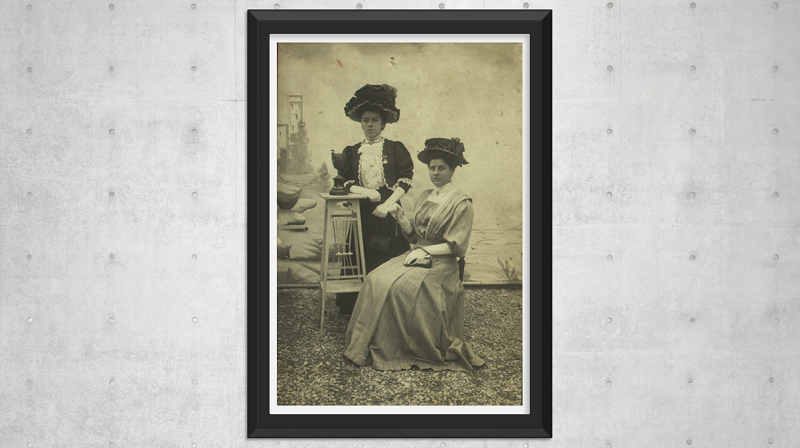 Aujourd’hui nous retrouvons une (peut-être deux…) protagoniste que je vous ai déjà présentée à la lettre B. Identifiée formellement et dont le nom est inscrit au dos de cette photo, Marguerite Chenin (1886 – ?), notre arrière-grand-mère, la mère de notre grand-mère Paulette. À nouveau, nous sommes dans la Meuse, et certainement à Bar-le-Duc. Cette scène a été minutieusement préparée, nous faisons face à un décor de photographe professionnel, et les deux demoiselles semblent poser selon les recommandations d’un œil expert. Elles ont revêtu pour l’occasion des robes qu’elles ont sans aucun doute mis des heures à ajuster. Je ne parle même pas des chapeaux ! Je n’ai aucune information supplémentaire à vous livrer pour l’instant sur le pourquoi de cette photo, ou l’occasion particulière pour laquelle elle aurait été réalisée.