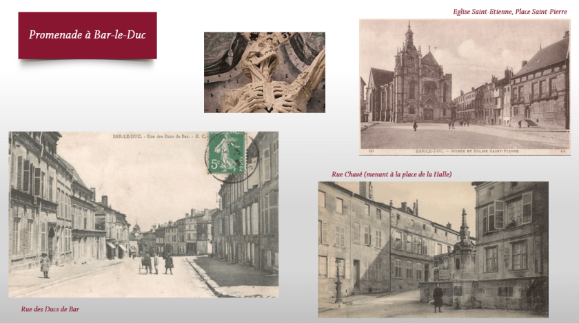Nicolas a 78 ans lorsqu’il s’éteint à son domicile au dit Bar, 4 rue de la Halle. Cette rue ne semble plus exister mais il y a une place de la Halle ainsi qu’un Passage de la Halle, je ne crois pas trop m’avancer en imaginant que le couple logeait dans la proche périphérie. Marie tirera elle sa révérence à l’âge de 86 ans, un an après son époux. Elle était alors domiciliée au 46 rue de Tribel. Ces deux emplacements sont situés dans ce qu’on appelle la ville haute de la commune, et sont tout près de la rue des Ducs ou de l’église Saint-Etienne (abritant le Squelette de Ligier Richier qui marque à vie, surtout quand on a fait sa connaissance durant ses jeunes années). Cette petite promenade de conclusion parlera sans aucun doute à certains de mes lecteurs du cercle familial proche, à qui je souhaite, comme à tous mes autres lecteurs et à la sympathique tribu des généablogueurs, une très belle nouvelle année.