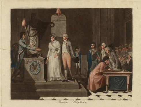 Illustration 1 : « Mariage républicain » – Estampe de Pierre François Legrand, 1794, Musée Carnavalet – Illustration 2 : Archives de la Marne, cadastre, plan général du village de Vroil en 1806 – Illustration 3 : Geneanet, Wikipedia