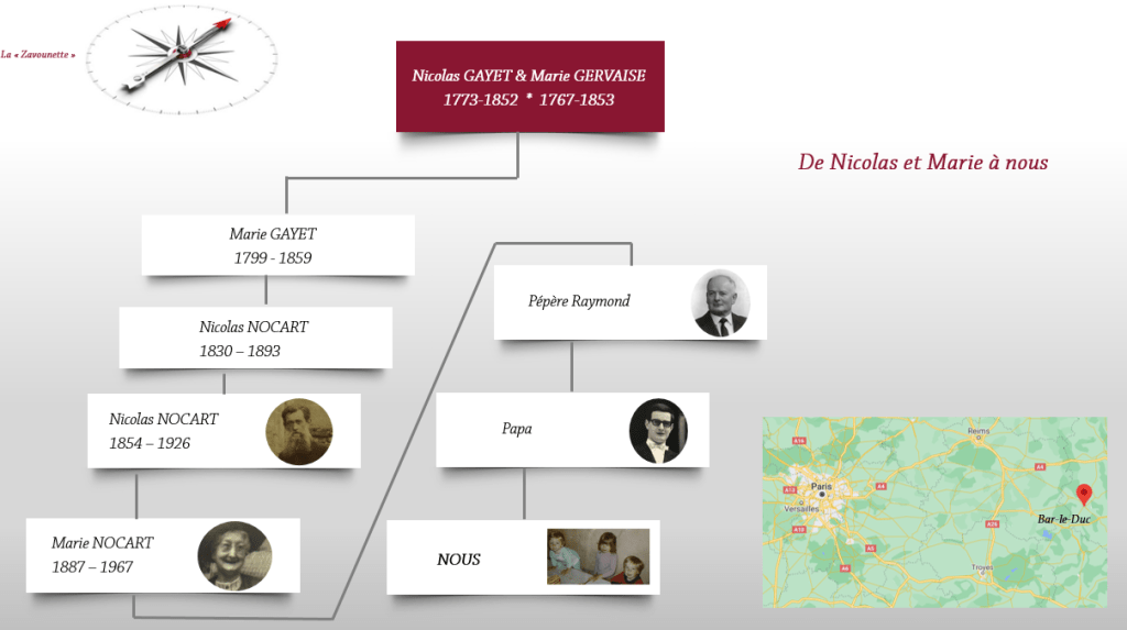 Un grand merci à mes cousins Colette et Jean-Claude dont les avancées sur cette branche m’ont permis de retrouver les actes correspondants à cette tranche de vie en vitesse accélérée.
