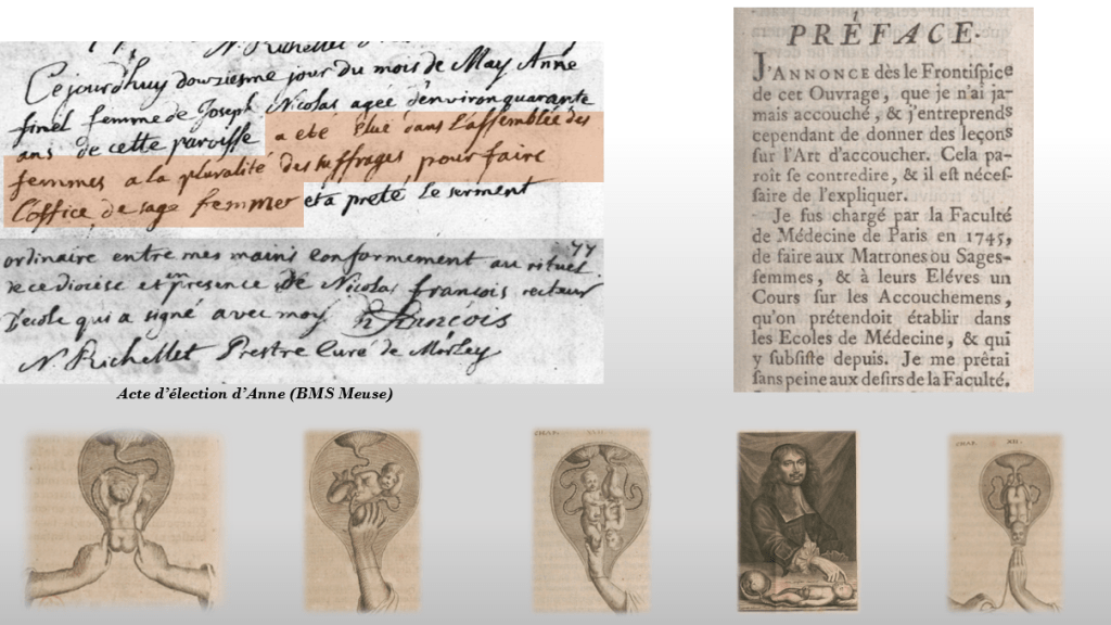 Remontons un tout petit peu notre arbre et arrêtons-nous sur la fratrie de Nicolas. Notre charpentier avait cinq frères et sœurs. Seuls l’aînée Anne, Nicolas et le dernier, Joseph fonderont une famille. Si Nicolas était charpentier, je n’ai pas croisé le métier de Joseph dans les actes dont je dispose. Cependant, chose rare et inestimable, j’ai retrouvé l’activité de notre collatérale Anne (merci sérendipité, la meilleure amie des généalogistes). Elle fut en effet (…) élue dans l’assemblée des femmes à la pluralité des suffrages pour faire l’office de sage-femme et a prêté le serment ordinaire entre mes mains conformément au rituel de ce diocèse (…). Par chance pour nous, l’élection a été couchée sur le papier dans le registre BMS par N. Richellet, prêtre curé de Morley. Nous sommes le 12 mai 1748, une semaine jour pour jour après l’inhumation du père d’Anne et de Nicolas. Anne a alors quarante ans, elle a déjà transmis la vie cinq fois et donnera encore naissance à trois enfants dans les années qui suivent. Les illustrations qui accompagnent ici le précieux acte sont tirées de l’ouvrage Observations sur la pratique des accouchements, naturels, contre-nature et monstrueux par Cosme Viardel (octobre 1747). Et l’extrait que je n’ai pas résisté à afficher – relu à plusieurs reprises voulant être sûre que mes yeux lisaient bien ce qui était rédigé – est tiré de l’Art d’accoucher réduit à ses principes par J. Astruc (janvier 1761). Ces deux livres sont librement consultables dans leur intégralité sur le site Gallica.