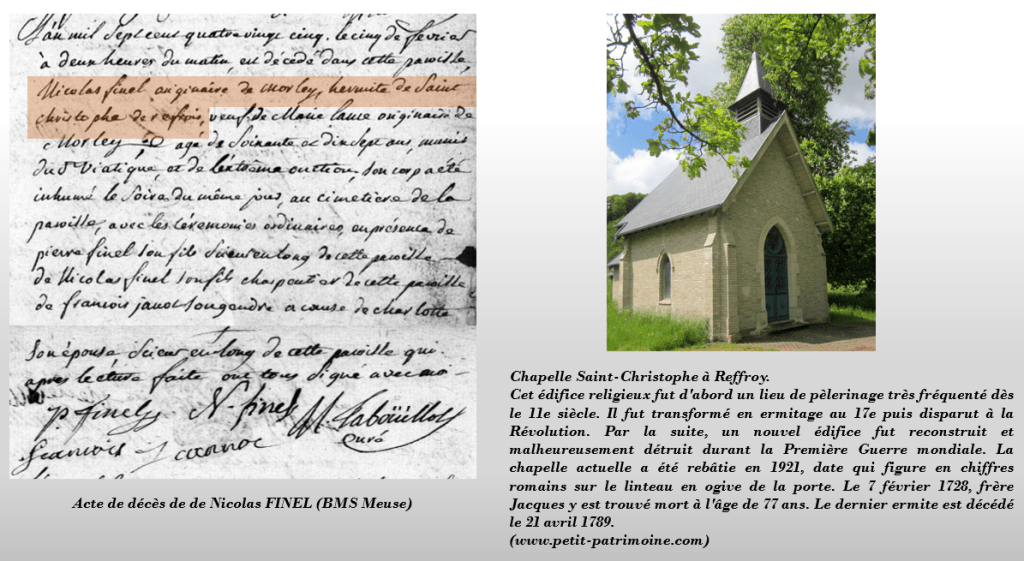 Marie disparaît bien jeune et laisse à son époux la charge de cinq enfants (l’aîné, notre ancêtre est déjà mari et père), dont le dernier n’a que quatorze ans. Deux garçons seront très vite mariés, un mois puis deux mois après la disparition de leur mère. Il ne restera au foyer de Nicolas que deux filles, et le benjamin. L’une d’elle partira vivre sa vie d’épouse douze ans plus tard. La seconde ne sera jamais mariée et finira sa vie chez un de ses frères. Quant au benjamin, François, il disparaîtra très prématurément au domicile de son père, âgé de seulement vingt-trois ans. Est-ce tout cet enchaînement d’épreuves, ou le fait d’avoir survécu deux longues décennies à son épouse ? Un peu des deux sûrement, toujours est-il que Nicolas est hermite de Saint Christophe de Refrois lorsqu’il s’éteint. Je ne sais pas depuis combien de temps il apaisait ses peines dans la spiritualité, mais cette information supplémentaire sur son acte de décès a bien sûr fait ma joie.