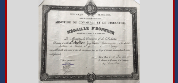 MINISTÈRE DU COMMERCE ET DE L’INDUSTRIEMÉDAILLE D’HONNEURINSTITUÉE PAR LE DECRET DU 16 JUILLET 1886 Le Ministre du Commerce de l’Industrie décerne à Monsieur SCHEFFER Jean-Pierre,