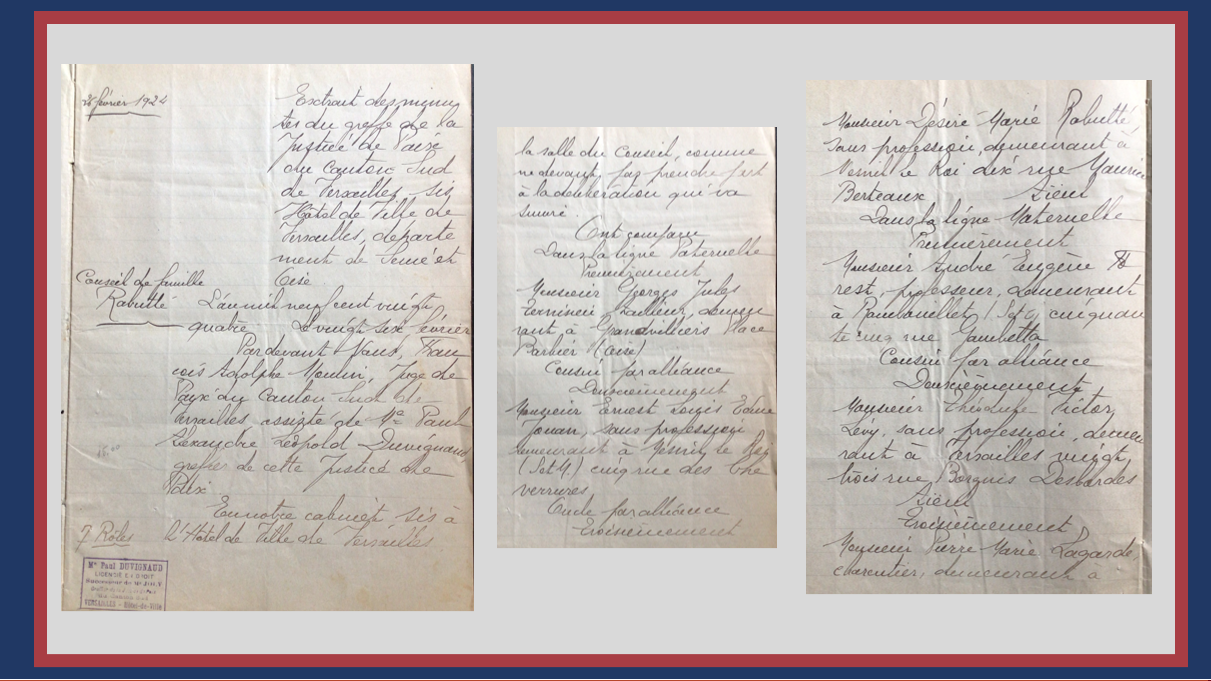 Nous apprenons ainsi que par la suite du décès de son époux, Léa Geneviève était devenue tutrice naturelle et légale de son enfant mineure et qu’en mars 1923, un premier Conseil de Famille présidé par le Juge de Paix du Canton Sud de Versailles a nommé Mr Levy (grand-père maternel) et Mr Rabutté (grand-père paternel) subrogé-tuteurs. Que pour se conformer à la loi, elle a convoqué à comparaître devant Nous, à ces jour, lieu et heure parents et amis qui doivent avec Nous et sous notre présidence composer le Conseil de Famille de son enfant mineure à l’effet de délibérer sur l’autorisation touchant son maintien dans la tutelle de son enfant mineure en vue de son prochain mariage avec Monsieur Louis Meyer, avec l’adjonction du dit Monsieur Meyer son futur mari pour co-tuteur, conformément aux dispositions de l’article… Ainsi, après présentation de sa requête, Léa Geneviève est sortie de la salle du conseil, ne devant pas prendre part à la délibération. Comparaissent alors Monsieur Ternissien, un cousin par alliance, Monsieur Jonon, un oncle par alliance et Monsieur Rabutté, aïeul de l’enfant pour la ligne paternelle. Viennent ensuite pour la ligne maternelle, Monsieur Forest, un cousin par alliance, Monsieur Levy, aïeul de l’enfant et Monsieur Lagarde, un ami. À l’issue du Conseil, Léa Geneviève est maintenue dans la tutelle de sa fille mineure vis-à-vis de laquelle elle a toujours fait preuve d’affection et sollicitude. Il est également accordé à l’unanimité que son futur époux devienne co-tuteur de l’enfant.