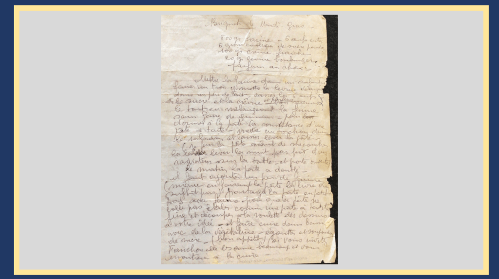 Le 30 janvier 1971, notre grand-mère paternelle prend possession du verso d’un courrier envoyé par notre grand-père à la famille, afin d’y transmettre sa recette de beignets. Je sors du sujet un petit instant pour préciser que sur le recto du courrier, il est fait un grand remerciement pour le Saint-Nectaire qui a bien été reçu, et en bon état (?!?!?! on reste dans les saveurs gustatives…). Je n’ai que peu de souvenirs de la cuisine de mon aïeule, en revanche je me rappelle bien les merveilles que notre mère a pu faire, s’appuyant sur cette recette ancestrale, encore précieusement conservée entre les livres de cuisine.