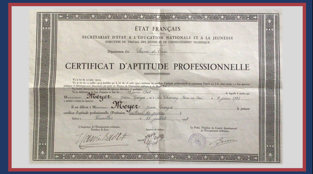 C’est à priori tout naturellement que notre grand-père Jean a donc orienté ses études dans le même domaine, pour prendre la suite de la marbrerie après son propre père. Son C.A.P. lui a été délivré à la fin de l’année scolaire 1943, le 31 juillet, à Versailles. Jean a alors 18 ans. Il ne mettra pas aussitôt ses compétences à profit puisqu’il répond d’abord à ses obligations militaires, et part jusqu’en novembre 1946 en Tunisie (voir article Bons baisers de Tunisie ). À la lecture des échanges épistolaires entre mes grands-parents, les mois qui précédèrent leur union, soit de novembre 1946 à septembre 1947, je sais que Jean a intégré la marbrerie familiale dès son retour d’Afrique. Il a ainsi rejoint son père pour préparer la prochaine transmission de l’entreprise, et je peux vous souffler discrètement à l’oreille que si les relations entre les deux hommes étaient toujours respectueuses, l’ambiance au magasin était, comment dire, … comme quand deux très forts caractères se côtoient quotidiennement !