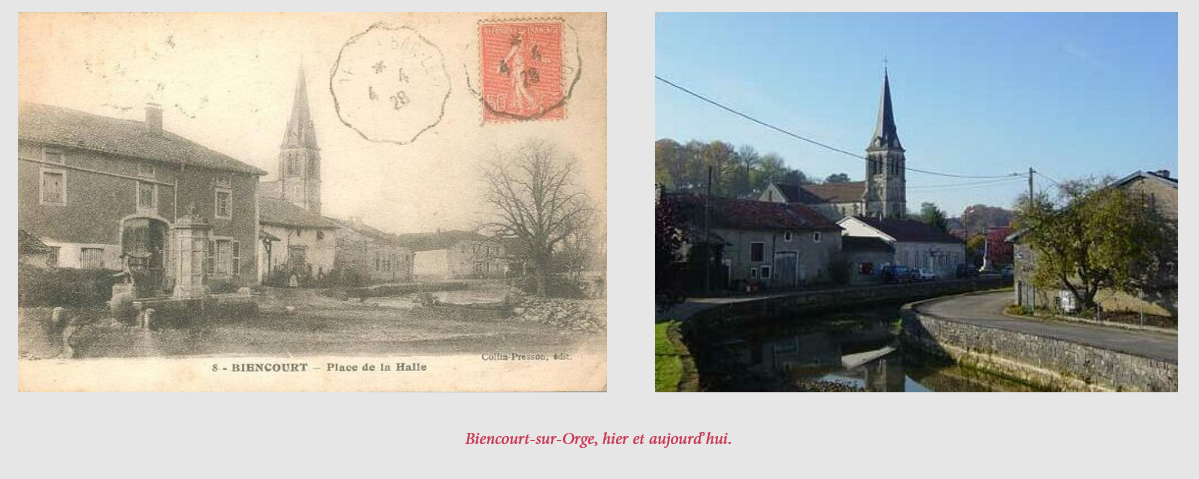 Je ne pouvais pas passer à Biencourt-sur-Orge sans faire une petite halte. En effet, pas moins de 80 entrées apparaissent dans ma base à l’interrogation de cette commune située dans la Meuse. C’est Victoire NICOLAS, la mère d’une de nos arrière-grand-mères paternelles, Marie NOCART, qui la première fait entrer Biencourt dans la liste des lieux rattachés à notre arbre. En l’état actuel de mes recherches, son ascendance y est toujours du côté de son père Jules dont j’ai remonté les branches jusqu’au début du 18e siècle, et les ancêtres de sa mère Marguerite THIEBAUT se partagent eux entre Biencourt et Morley, commune toute proche, toujours dans la Meuse mais à la limite de la Haute-Marne.