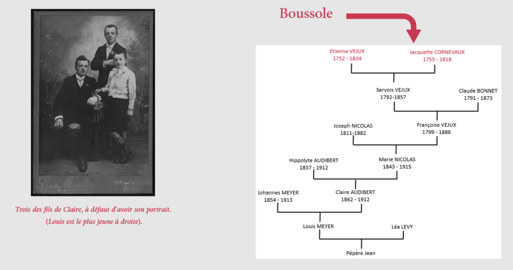 Puis arriva le jour où je décidai de m’attaquer à la branche de notre arrière-arrière-grand-mère Claire AUDIBERT, laissée longtemps de côté pour ce qui est de l’ascendance parce qu’occupée sur d’autres quartiers. Pour ceux qui suivent, Claire est notre bisaïeule qui me donne du fil à retordre, la seule de cette génération, avec son époux, l’ancêtre suisse, dont je ne peux à ce jour associer un visage au nom. Je ne rencontrai aucun problème à retrouver la mère de Claire, Marie Louise NICOLAS, née dans l’actuel département de l’Essonne, rien d’extravagant, recherches routinières, on ne sort toujours pas de l’Ile-de-France. C’est sur la génération du dessus (G7) que l’étonnement m’a fait ouvrir de grands yeux à la lecture des actes de décès – décès qui ont eu lieu sans surprise dans l’Essonne. Joseph NICOLAS était né à Cerre-lès-Noroy et Françoise VEJUX était native d’Autrey-lès-Cerre, deux communes de Haute-Saône. Jamais ce département n’a été évoqué lors de toutes nos discussions avec ma grand-mère lorsque nous parlions généalogie. Ce n’est pourtant pas si haut dans l’arbre ? si quand même un peu… et surtout nous sommes dans l’ascendance de son époux notre grand-père Jean, peu loquace sur ces sujets, et dont les aïeux paternels sont décédés avant sa naissance, ce qui expliquerait qu’elle ne m’ait jamais emmenée voir Vesoul (vous l’avez ?) dans ses récits.