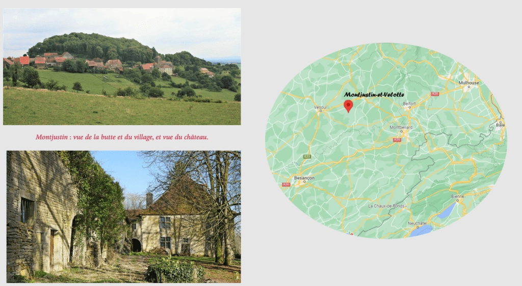 N’y allons pas par quatre chemins, – à Montjustin-et-Velotte 😊 – si j’ai choisi de passer par cette commune de Haute-Saône en région Bourgogne-Franche-Comté c’est parce que ce nom m’a fait de l’œil lorsque j’ai fait défiler la colonne « lieux » de mon logiciel généalogique, afin de déterminer les escales de notre voyage annuel. Vous admettrez qu’on ne croise pas de Montjustin-et-Velotte tous les quatre matins. Et je trouve que ça sonne bien Montjustin-et-Velotte, c’est frais, c’est fleuri, c’est juste joli ! Passées ces considérations très personnelles qui n’apportent pas grand-chose à la recherche ancestrale, mais qui m’ont permis d’écrire trois fois Montjustin-et-Velotte (quatre fois maintenant…), il faut noter que lorsque j’ai commencé à remonter les branches de notre arbre, mes recherches tournaient autour de l’Yonne, de la Meuse et de la région parisienne. Pas bien loin, terrains connus en virtuel comme dans la vraie vie, bref rien d’étonnant.
