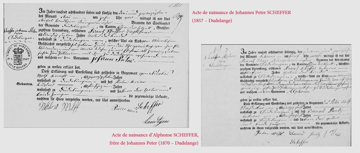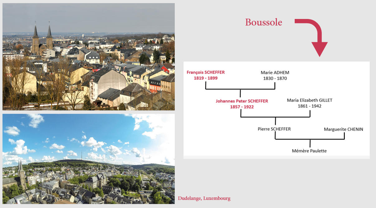 Incartade au Luxembourg aujourd’hui, puisque nous traversons la frontière pour aller à DUDELANGE, commune du canton d’Esch-sur-Alzette fortement développée grâce à la métallurgie et à la sidérurgie, très prospère pendant les XIXe et XXe siècles. Nous sommes juste à côté – moins d’un kilomètre – de Volmerange par laquelle nous sommes passés à la lettre E. DUDELANGE est la commune de naissance du grand-père paternel de notre grand-mère Paulette, Johannes Peter SCHEFFER. Ses parents François, un négociant, et Marie ADHEM ne sont pourtant pas natifs du Luxembourg. Ils virent le jour en Moselle où ils se marièrent. Ce n’est qu’après leur union en 1855 que nous les retrouvons au Luxembourg. Les sept enfants du couple dont Johannes y sont nés. Au moins deux n’ont vécu que quelques mois. Les actes de naissance sont rédigés en allemand… peut-être bien gothique pour rajouter un peu de piment à l’histoire ! Et très étonnamment, si les actes des premiers bambins présentent les prénoms en version germanique (Johannes-Peter, Anna, Catharina), les derniers de la fratrie sont rattachés à des actes de naissance pour le moins singuliers, rédigés dans une langue dont je ne comprends absolument rien mais où apparaissent un Michel ou un Alphonse bien compréhensibles, bien français et très lisibles là où je ne les attendais pas.
