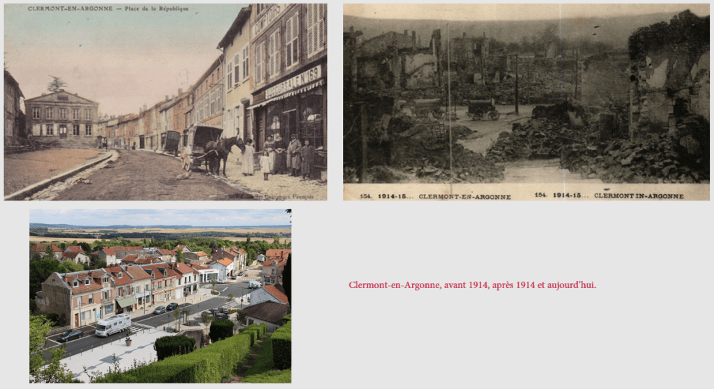 Nous restons en Région Grand-Est aujourd’hui mais nous retrouvons dans le département de la Meuse avec une promenade à CLERMONT-EN-ARGONNE. Ancienne ville fortifiée jusqu’en 1654, la commune a compté environ 2 500 habitants vers 1630. Après le siège de 1654 et la destruction partielle de la ville, la population est tombée à environ 600 habitants. Elle en compte actuellement 1545. Autrefois ville frontière importante, elle était convoitée par les rois de France. CLERMONT ayant été détruite à 90% lors des combats de 1914, il n’y a aucune chance de retrouver des lieux de vie de nos ancêtres. C’est pourtant une grosse branche de notre arbre qui se trouve perchée là-bas, toute l’ascendance de Louise PONSIGNON, la grand-mère maternelle de notre grand-mère Paulette, qui y est née en 1862. Fille de Louis Philippe, et d’Elisabeth AUBRY elle apparaît fille unique en l’état actuel de mes recherches. Et je ne peux me rappeler si c’est un fait ou si je ne suis tout simplement pas partie à la recherche d’une potentielle fratrie. Louise eut cinq enfants dont trois vécurent. Elle exerça la même profession que son époux, Joseph CHENIN qui était garde-barrière.