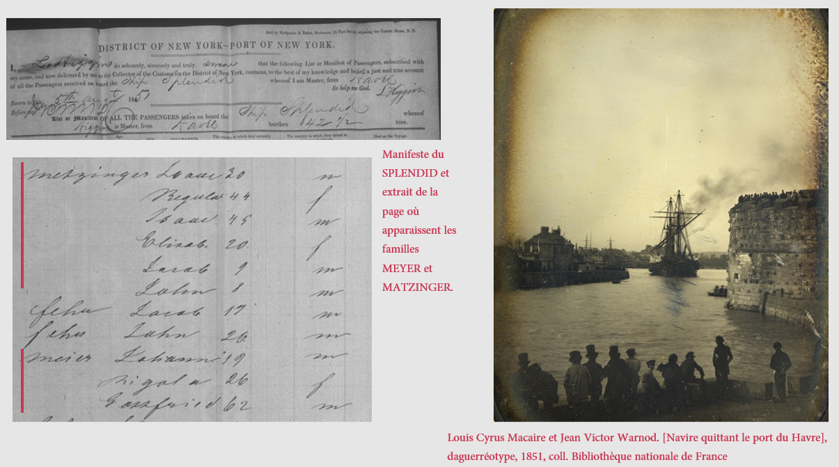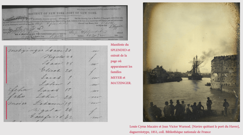 Il était mentionné sur le formidable site de notre cousin Willi (voir lettre S) que Johannes (le grand-père) avait émigré aux USA, état de l’Ohio en 1851. Mais moi j’aime bien avoir des sources, des preuves, que je ne trouvais pas sur la feuille de famille de notre ancêtre. Un échange avec Willi, qui m’a gentiment transcrit les quelques lignes rédigées sur cette même feuille, me confirma que je n’étais pas sortie des ronces avec la branche suisse ; le problème est bien pire que la simple traduction, je n’avais même pas réussi à déchiffrer Ohiostaat… Bref, forte de ces informations je retrouvais Johannes, sa troisième épouse Regula, et son dernier fils Gottfried, sur le manifeste (liste des passagers) du navire SPLENDID. Partis le 19 juin 1851 du Havre, ils sont arrivés à New-York le 5 août suivant. Mais une épine s’est rapidement présentée, puisqu’ils sont arrivés certes, et se sont envolés. Disparus, évaporés. Je ne les ai retrouvés nulle part ailleurs. J’ai passé des heures et des heures sur FamilySearch, de recensements en registres BMS, sans rencontrer le début du commencement d’un indice. Sur le point de renoncer pour aller m’éparpiller ailleurs, j’envoie pour clore cette parenthèse américaine une copie du manifeste à Willi afin qu’il puisse le joindre comme source sur son site, et je lui raconte en même temps que j’ai perdu mes petits à New-York. C’était sans compter sur les connaissances de notre cousin suisse, qui maîtrise bien mieux que moi les imbroglios familiaux, et m’informe en retour qu’un couple MATZINGER se trouve sur ce même bateau, couple dont la femme est la cousine de notre Johannes. Il pense ainsi que quand les familles ont mis les voiles ensemble, elles restent généralement ensemble à l’arrivée. En retrouvant le couple MATZINGER, je devrais retrouver par là même notre ancêtre et sa famille. J’ai bien rattrapé le couple MATZINGER, à SPENCER dans l’OHIO. Et j’aurais déjà matière à rédiger quelques billets sur la famille MATZINGER, qui a laissé bien des traces en Amérique (des collatéraux, encore…). Mais à ce jour, je n’ai toujours pas remis la main sur notre ancêtre… Cet épisode américain fut assez intensif et il est possible qu’au bout d’un moment, mes yeux n’y voyant plus grand-chose, aient laissé filer quelques indices. J’y retournerai !
