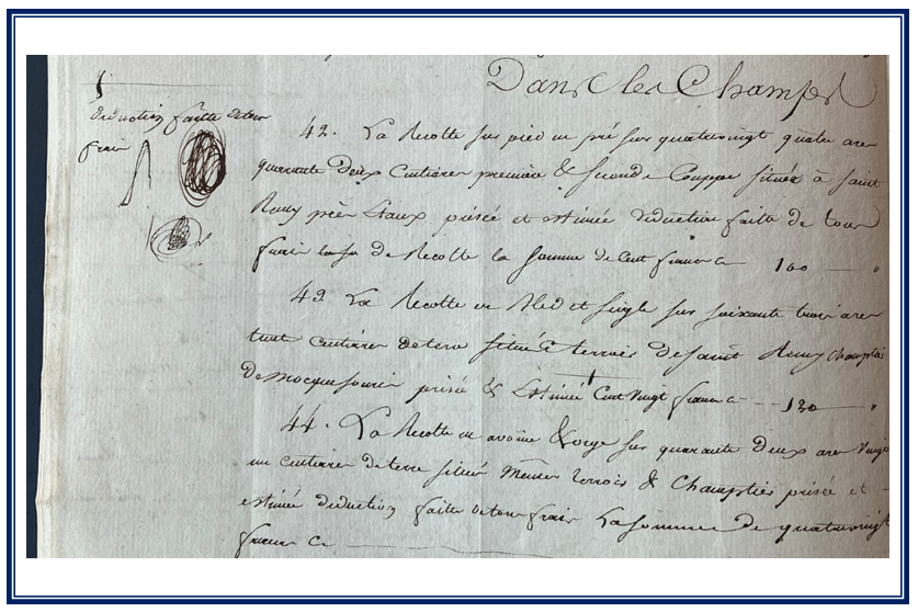 Visite générale : Une maison située à Saint-Rémy-lès-Chevreuse, dans une ruelle conduisant aux deux Chemins, de Chevreuse à Paris. La maison est louée à une veuve, propriétaire à Chevreuse. Logis dans ladite maison, ayant vue sur ladite ruelle. Un fournil à côté du dit logis, ayant entrée par une porte donnant sur ladite ruelle et vue par derrière. Un grenier au-dessus du fournil. Une petite bergerie ayant entrée sur ladite ruelle. Une autre petite bergerie à côté de la précédente. Une autre petite maison située à Saint-Rémy, sur la grande route de Paris, ayant entrée et vue sur ladite route. Une petite écurie à côté de ladite maison. Un grenier au-dessus. Vide. Deux greniers dépendants d’une maison appartenant au Sieur HELY (patronyme de notre arbre, pas sur cette branche) et occupée par le Sieur GRESLÉ, aubergiste. Il semble que tout l’immobilier soit loué, l’inventaire ne mentionnant que du mobilier et des marchandises.