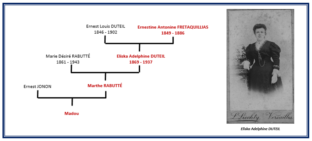 Broderies : Nous retrouvons pour débuter cette dernière semaine complète, la branche de notre grand-mère maternelle Madou. Ernest Louis DUTEIL et son épouse Ernestine Antonine sont ses arrière-grands-parents. Ernest Louis est dit cultivateur. Au vu de ce que nous avons croisé dans le cellier, je dirais même qu’il est vigneron ! Son épouse décède au jeune âge de 37 ans, alors que leur fille unique, Eliska Adelphine n’a que 17 ans. Cette dernière est l’unique héritière à la suite du décès de sa mère, représentée en tant que mineure par son père, tuteur naturel, et son grand-père maternel, Charles Ferdinand FRETAQUILLIAS, subrogé tuteur. L’acte du jour nous laisse entendre que la famille vivait plutôt très bien. Les pièces sont généreusement meublées, les armoires sont pleines et les étagères débordent. Nous avons également un paragraphe consacré aux bijoux dans lequel on note que les deux époux possédaient chacun leur montre, en or s’il vous plait. La maison dans laquelle l’inventaire a été établi est la demeure du couple et de leur fille, dans laquelle s’est éteinte Ernestine. Il est précisé dans le document que c’est une maison qui appartient à Jean Pierre DUTEIL, le père d’Ernest, et pour laquelle aucun loyer n’est demandé. Il en va de même pour quelques parcelles de terre, gracieusement prêtées par le même Jean Pierre et Charles Ferdinand FRETAQUILLIAS, son beau-père. À noter : l’inventaire nous apprend également qu’Ernestine est décédée de maladie. En effet, juste avant la clôture de l’acte, Ernest DUTEIL déclare que « les frais funéraires et de dernière maladie, occasionnés par le décès de sa défunte épouse, ont été acquittés par Monsieur FRETAQUILLIAS, sans réclamation de sa part ».