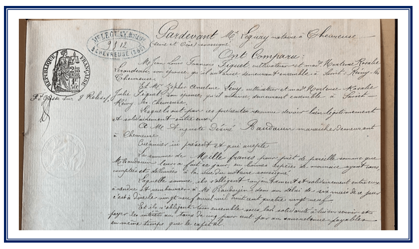 Broderies : Aujourd’hui nous n’entrons pas chez nos ancêtres, mais cette « obligation » nous permet tout de même d’avoir une idée de leur lieu de vie. En effet, il est mentionné que les deux maisons appartiennent à Jean Louis FIQUET et Rosalie Hortense LERONDEAU, qui sont les bisaïeux de notre grand-père maternel, sur une autre branche que celle d’hier. Les deux prairies sont la propriété de Zéphyr Anselme LEVY et Julie Rosalie FIQUET, fille du couple cité en premier. Il me faudrait consulter le cadastre pour valider que le couple FIQUET vit dans la première maison et que le couple LEVY occupe bien la seconde, mais je pense que c’est une forte possibilité, déjà au vu des adresses des recensements. Cette obligation hypothèque tous les biens cités en échange du prêt, par Monsieur BAUDOUIN de « la somme de 1.000 Francs, faite ce jour en bonnes espèces de monnaie ayant cours, comptées et délivrées à la vue du Notaire. Laquelle somme ils s’obligent conjointement et solidairement entre eux à rendre et rembourser dans un délai de six mois ». Il n’est mentionné nulle part ce que vont faire nos ancêtres avec la somme empruntée. Gageons que je vais bien trouver ça en allant consulter les liasses du notaire sur les mois suivant la signature de cette obligation 😉