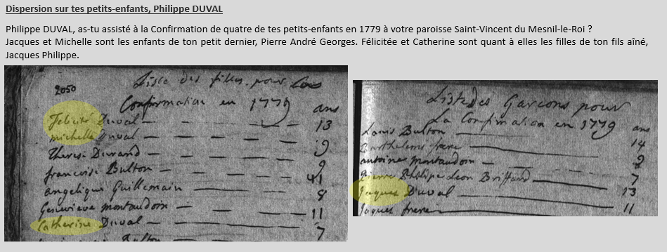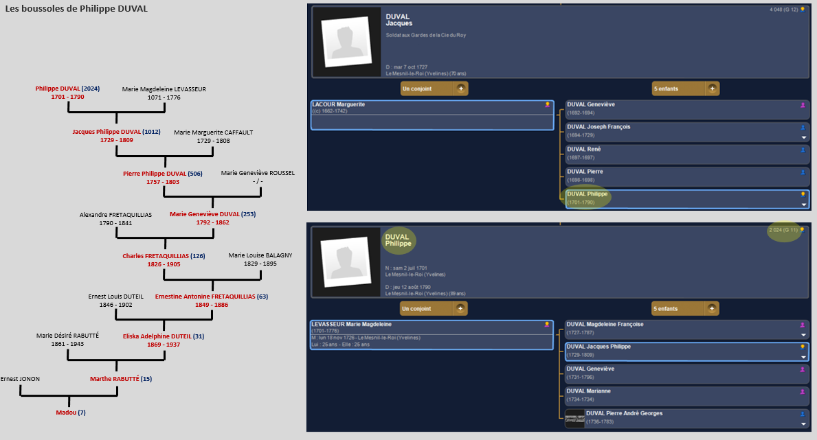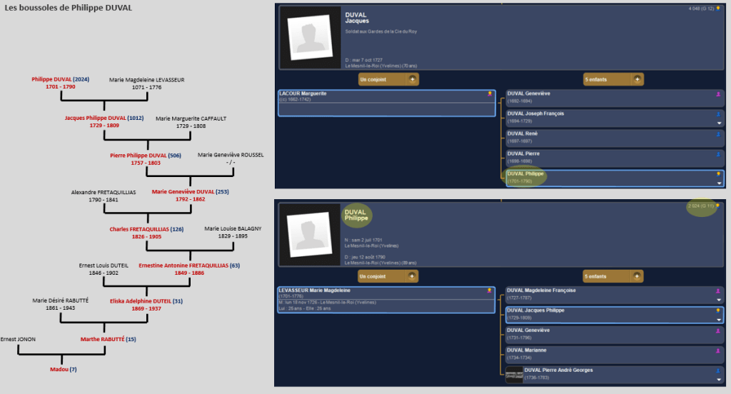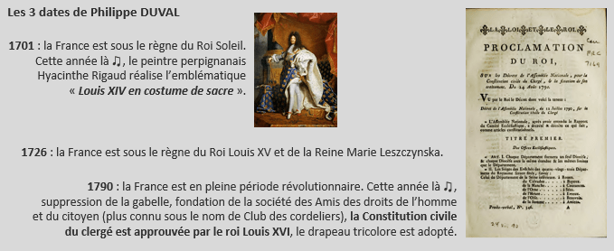 Philippe, tu as vu le jour au Mesnil-le-Roi (78) le samedi 2 juillet 1701. Fils de Jacques DUVAL et de Marguerite LACOUR, tu es baptisé le lendemain. En 1726 tu épouses une demoiselle Marie Magdeleine LEVASSEUR. Tu t’éteindras au même endroit en 1790, à l’âge plus qu’honorable de 89 ans. Tu es notre ancêtre à la génération 11.