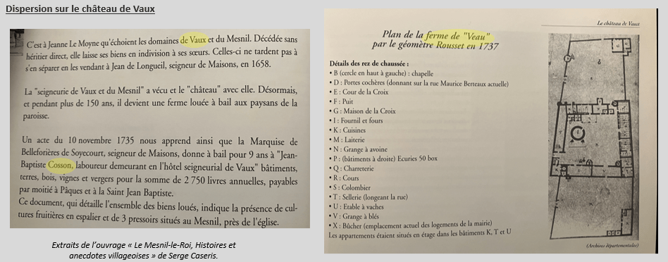 Le lundi 18 novembre 1726, tu épouses Marie Magdeleine LEVASSEUR. Vous êtes tous les deux âgés de 25 ans. D’après les certificats fournis lors de la cérémonie, il semble que ta promise soit originaire du PECQ, commune très proche. Les deux premiers témoins cités et présents en ce qui te concerne sont ton père Jacques et ton frère Joseph François. Tout comme toi, ils déclarent ne savoir ni écrire ni signer. Ta mère Marguerite LACOUR est toujours en vie, aussi je doute fort qu’elle ait eu mieux à faire en ce lundi de novembre que d’assister aux épousailles de son fils cadet. Cependant, elle n’apparaît pas, hormis en introduction, à l’énoncé de ton ascendance. Eh oui Philippe, c’est assez stupéfiant mais à ton époque les femmes sont transparentes. Il eut fallu qu’elle soit veuve pour être citée en tant que personne présente ; et encore, ça ne marche pas à tous les coups, un oncle ou un beau-frère peut être pris en compte, gommant purement et simplement la présence d’une mère aux côtés de son enfant s’engageant pour la vie. Ton acte de mariage ne laisse entrevoir aucun métier que tu pourrais exercer, cependant un troisième témoin, signataire du document de ton côté, va nous orienter. « Jean COSSON, son receveur de la ferme de Veaux ». Monsieur le Curé parle sans aucun doute de la ferme du château de Vaux. Tu n’as donc pas suivi comme ton père une carrière militaire – il est qualifié de « Soldat aux Gardes » dans son acte d’inhumation. Tu as travaillé la terre, comme la majorité de nos ancêtres.