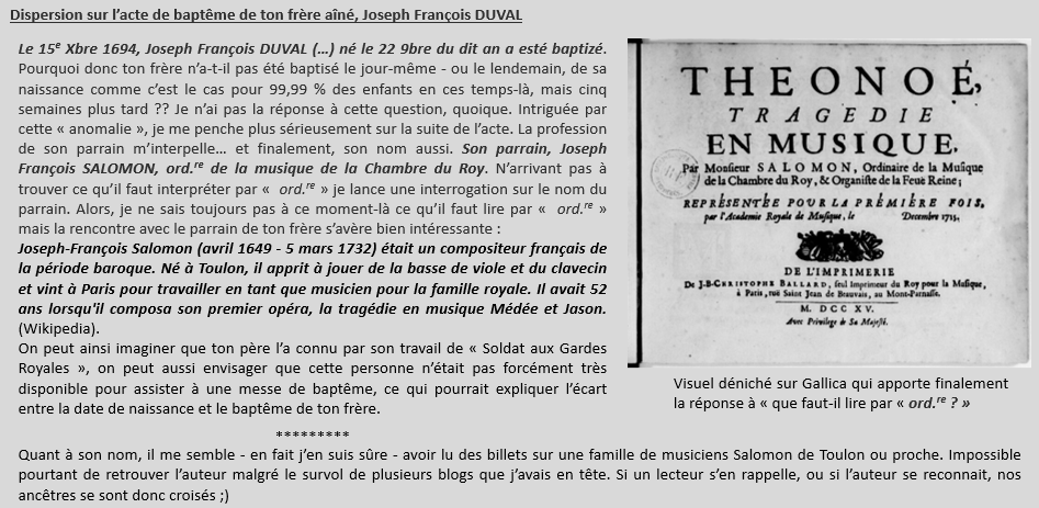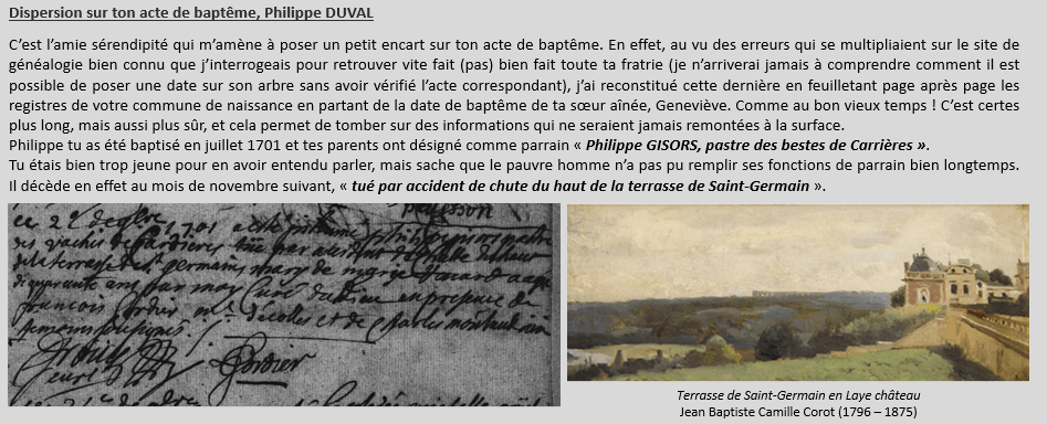 Tu es le dernier enfant d’une fratrie de cinq. L’aînée (supposée), Geneviève, naît en 1692. Elle ne vit malheureusement que deux petites années. Je dis « supposée » car vois-tu, à peine les recherches sur ta vie entamées, est arrivé ce moment où tu as juste envie de refermer l’ordinateur, car tu t’aperçois qu’il y a une lacune de 9 ans, juste avant 1692, dans les registres de ta paroisse, englobant à la perfection la date présumée du mariage de tes parents, et donc les dates de naissances des premiers enfants du couple. Après avoir soupiré très fort et proféré quelques mots que je ne reproduirai pas ici, reprenons donc. Deux ans plus tard, au mois de décembre 1694, tes parents ont fait appel à Monsieur le Curé à deux reprises, passant certainement par un ascenseur émotionnel de catégorie supérieure. Ils accompagnent en effet au cimetière leur première fille Geneviève le jeudi 9 et font baptiser ton frère aîné, Joseph François, le mercredi suivant, 15 décembre 1694. Viennent ensuite René et Pierre, nés respectivement en 1697 et 1698 qui ne vivront que quelques jours pour l’un, et quelques mois pour l’autre. Enfin, en juillet 1701, tu fais ton entrée dans le foyer des DUVAL. Tu vas apporter de la compagnie à ton frère Joseph François alors âgé de 7 ans, qui devait trouver le temps bien long et bien triste après le passage express sur cette terre de vos frères et sœur, que tu n’auras jamais connus. Je ne pense pas que tes parents eurent d’autres enfants, les registres après ta naissance ne faisant apparaître aucun nouveau baptême DUVAL. Les actes beaucoup plus tardifs relatifs à ta famille ne mentionnant toujours que toi et ton frère, j’imagine que les années lacunaires n’occultent finalement que la date de mariage de tes parents, et peut-être des enfants qui n’ont pas vécu.