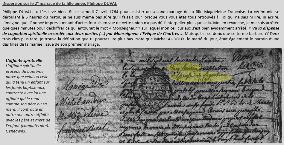 Philippe DUVAL, tu tires ta révérence un jour du mois d’août 1790 et tu es inhumé le lendemain, accompagné pour cet ultime voyage de tes deux fils Jacques Philippe et Pierre André Georges. Magdeleine Françoise et Geneviève leurs sœurs sont probablement aussi du cortège, mais rappelle-toi, les femmes, la transparence, tout ça… Ton épouse bien-aimée t’attend depuis 14 ans déjà dans le petit cimetière du Mesnil où vous reposerez pour l’éternité. J’ai le sentiment à l’entame de cette dernière partie de récit que tu es froissé par les impasses que j’ai faites en ce qui la concerne ; parce que oui tu as raison, même transparente sur les écrits, elle a bien sûr dû partager avec toi les joies et les peines qui ont ponctué votre vie. Eh bien note aussi que je n’ai pas creusé très à fond non plus la vie de vos enfants. Et pendant qu’on y est, sache également que si j’avais eu le temps de partir à la chasse aux actes notariés, j’aurais (peut-être) pu récolter plus de détails sur tes 89 années de présence ici-bas. Je t’invite cependant à bien relire le paragraphe sur le calcul du numéro Sosa. Selon toute vraisemblance et à moins d’une grosse révolution – qui n’arrivera pas je peux déjà te le prédire – notre Sosa 2025 sera Marie Magdeleine LEVASSEUR, ton épouse. Compte tenu de l’invisibilité dont je t’ai déjà parlée, il va bien falloir que je m’appuie sur toi, vos enfants et de potentielles liasses de notaires encore à chercher, pour lui rédiger un billet qui aille au-delà des trois dates incontournables. Nous nous recroiserons l’année prochaine Philippe DUVAL, c’est certain. Je te dis donc à bientôt !